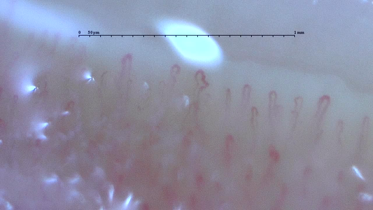 皮膚の表面ではUターンしている先端の部分しか見えないので、血流を肉眼では確認し辛いのですが、指先の爪があるところでは毛細血管が横に伸びていてUの字のように毛細血管を観ることができます。