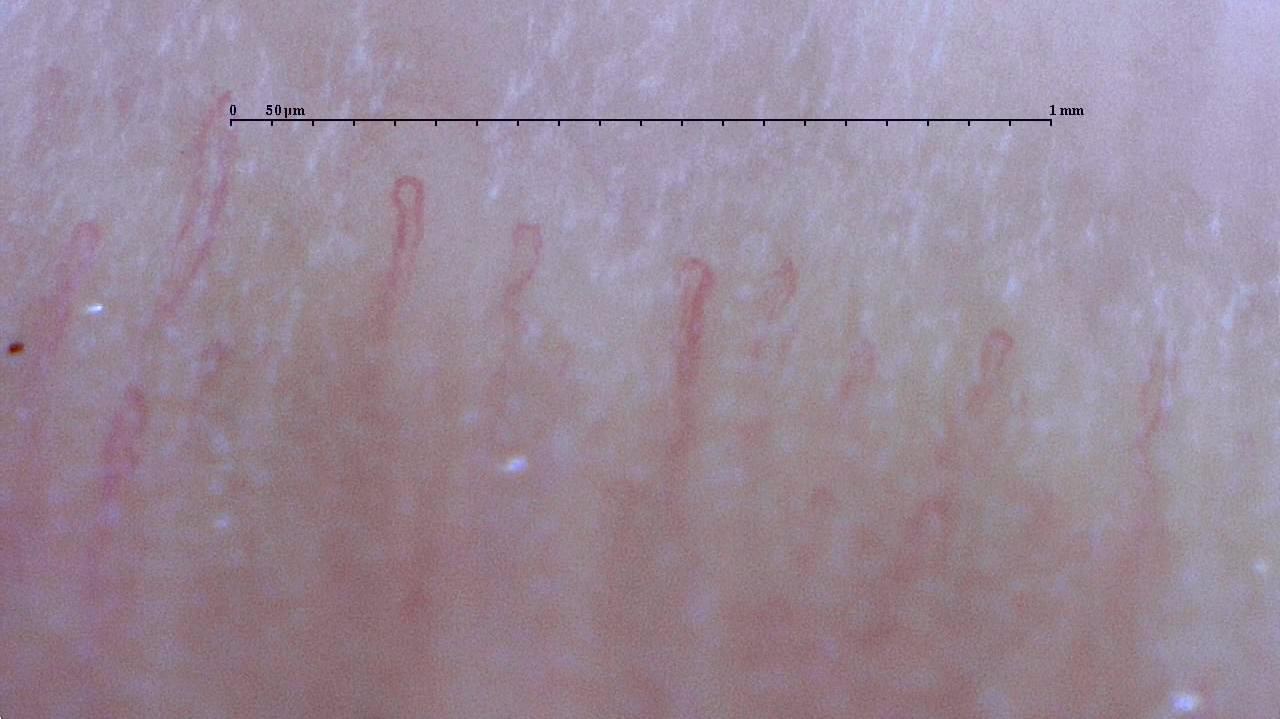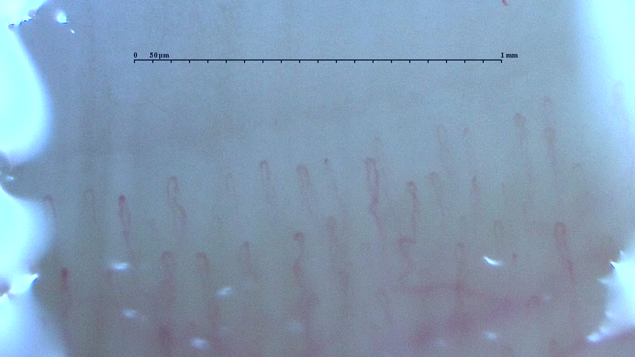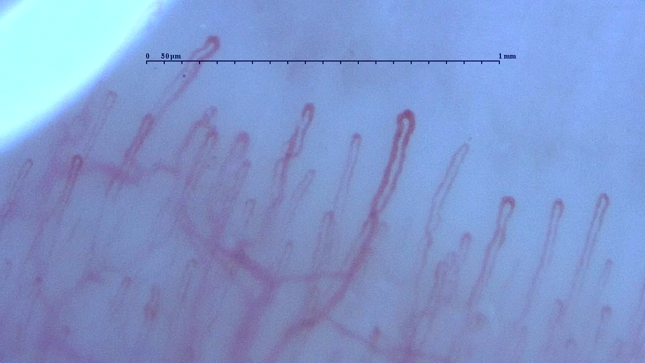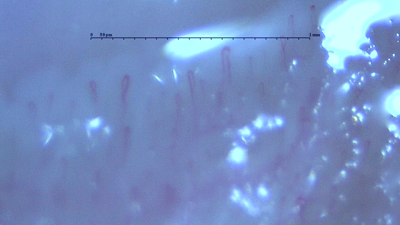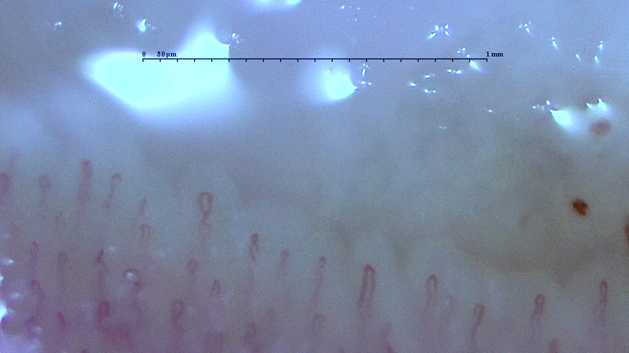 いろいろな毛細血管|You-MOST 2020/10/09 色々な人の毛細血管 今回は新しくなった毛細血管スコープで撮影した「写真」を掲載します。 見方のコツ 1.画面上のスケール幅は1mmで50㎛ごとに目盛があります。 2.オリーブオイルを塗布した上から撮影しているので光が反射していることがあります。 3.オイルにはヒアルロン酸が配合してあるので吸収され乾燥しかけた状態で撮影されているところもあります。 4.撮影する距離によって青みがかった色が出ます。